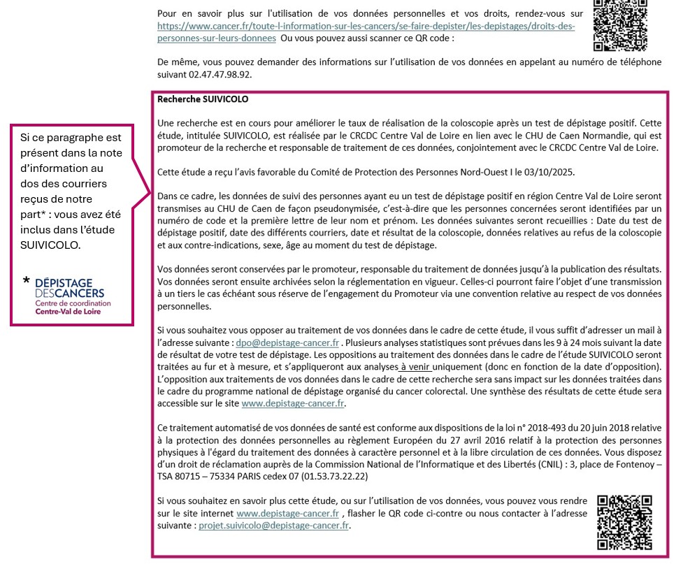 Les données relatives au suivi réalisé suite à un test de dépistage du cancer colorectal positif (données en lien avec le résultat du test positif et au suivi réalisé) des personnes incluses dans l’étude SUIVICOLO sont enregistrées par le CRCDC Centre Val de Loire comme pour toutes les personnes ayant un test positif. Ces données seront transmises à des fins d’analyse de façon non identifiante à l’équipe scientifique responsable du projet, au CHU de Caen.
